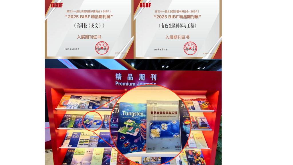 本网讯 近期,第三十一届北京国际图书博览会(BIBF)在北京国家会议中心举办。我校主办的中英文期刊《钨科技(英文)》《有色金属科学与工程》以“‘十四五’中国期刊精品回顾”为参展主题申报,双双入选本届博览会“2025中国精品期刊展”。其中,《钨科技(英文)》自去年首次入选“2024BIBF精品期刊展”后,再次成功入选“2025BIBF精品期刊展”,连续两年作为入展期刊在博览会上展出。《有色金属科学与工程》为首次入选此届博览会进行展出。
